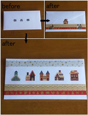 上の写真は、商品券の封筒を、クリスマス風にリメイクしてみたものです。
