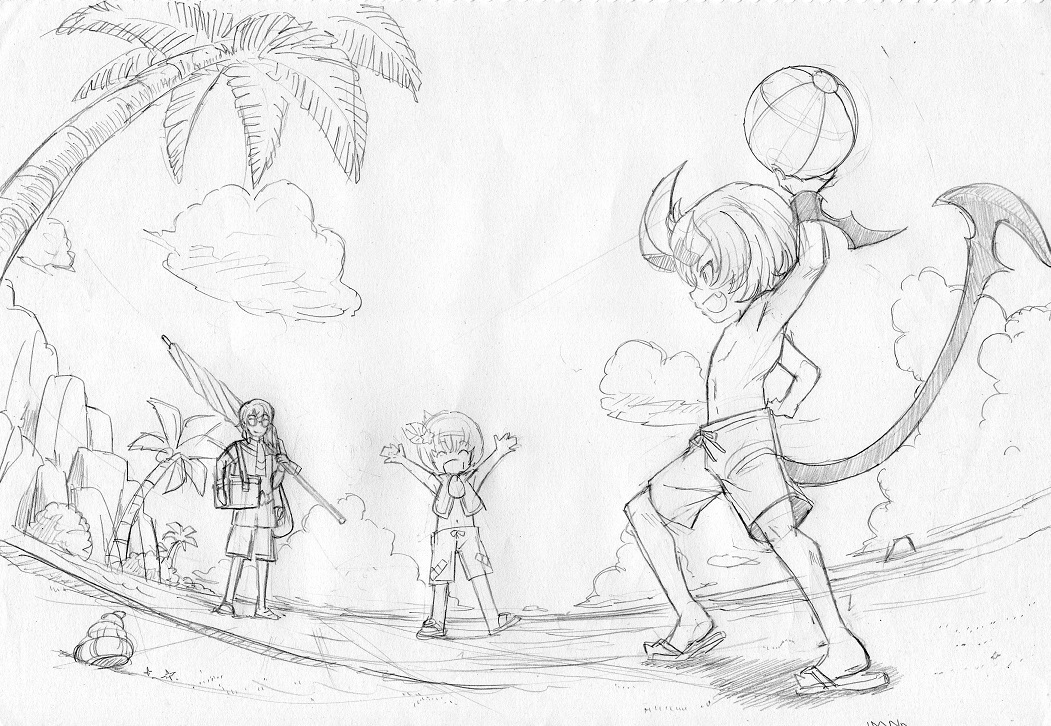 14章で海みてはしゃいでたヴァンさん、後日改めて居候させて頂いてる家主一家を誘って海に遊びに来てたら、という妄想図。