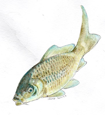 祖父が田んぼの水たまりから救ってきた魚を先週くらいに描いてみたのですが、コイなのかフナなのかわかりません^^;(サイズはフナくらい)