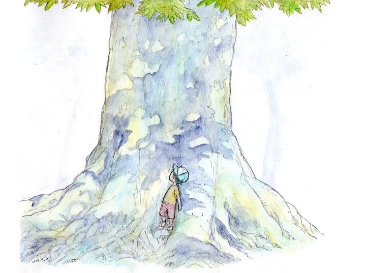 大きなケヤキの木と小さな男の子。