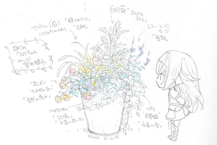 クロエちゃんイメージの寄せ植えとその設計らくがき(ROM)