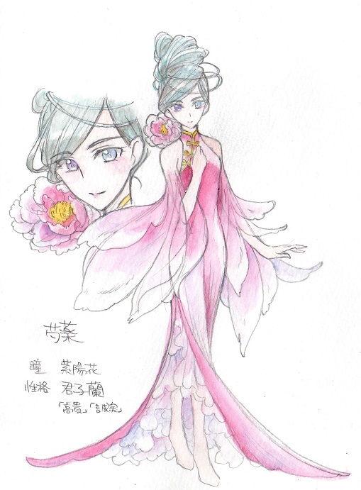 芍薬の擬人化、紫陽花色の瞳、君子爛の花言葉(高貴、誠実)のキャラクター。